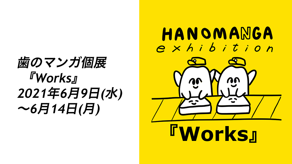 Works 会 期 2021年6月 9日(水) - 2021年6月14日(月) 時 間 11:00 - 20:00 *最終日は16:00まで 場 所 Creative Lounge MOV aiiima 1 歯のマンガの個展です。 昨今の情勢により働き方もどんどん変わっていく今、働き方と働く事について今一度考えて根本から見つめ直す展示です。 『働く』をテーマにドローイング、グッズの販売を行います。 (詳細については後日SNSにてご案内します) 歯のマンガ 『歯のマンガ』歯が活躍する漫画。SNSで人気に火がつく。小学館クリエイティブより単行本歯のマンガ発売中。 http://hanomanga.blog.jp/