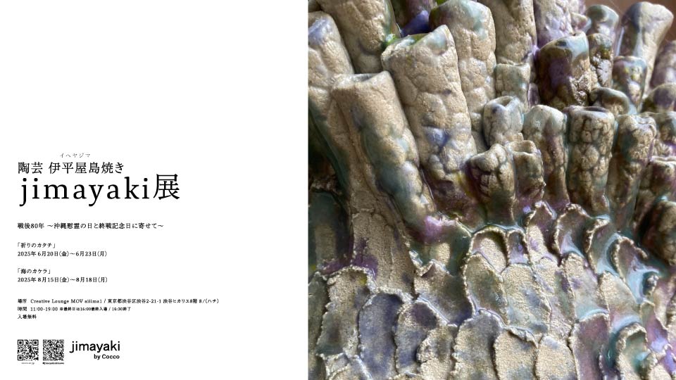 陶芸 伊平屋島焼き jimayaki展戦後80年 〜沖縄慰霊の日と終戦記念日に寄せて〜 会 期 2025年6月20日(金) - 2025年6月23日(月) 時 間 11:00 - 19:00 ※最終日は16:00最終入場 / 16:30終了 場 所 Creative Lounge MOV aiiima1 「祈りのカタチ」 2025年6月20日(金)〜6月23日(月) 入場方法およびjimayaki販売のご案内 詳細は jimayaki instagram をご覧下さい。 jimayaki by Cocco Cocco official site