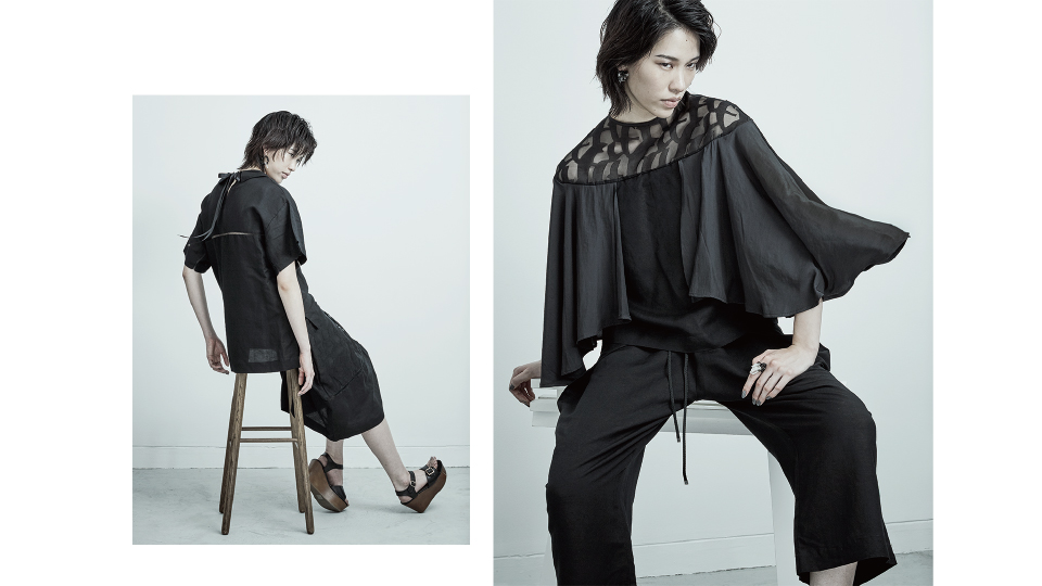 モノトーンを基調に、波のようなドレープや羽根のようなフリルを施した、独得なシルエットのお洋服をご覧頂けます。