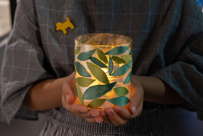 大小さまざまな葉っぱの隙間からのぞく、キャンドルの幻想的な光が印象的な作品は、小学生の女の子がつくったもの。「木漏れ日」というタイトルをつけた豊かな感性に、見る側の心も癒されました。