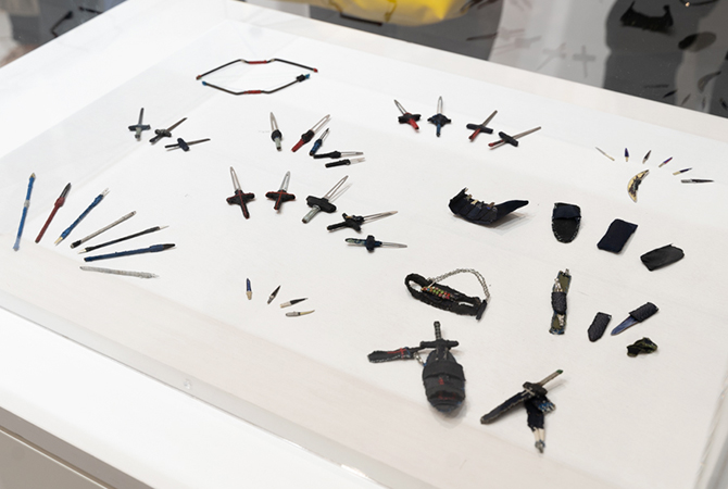 こちらは、中村俊彦さんの作品で「武器」。刀や槍、弓矢など手のひらに収まるほどの小さな武器は、ヘアピンやアルミ、糸や端切れなどを用いて作られています。刀を納めるケースには、刺繍なども施され、実物をそのままミニチュアにしたかのような武器作品の数々に、息を飲みました。「好きなものに対する執着やこだわりは細部への工夫に表れていて、そしてそこにかける集中力は、障害があるから故のものなのかもしれません」と中津川さんは話します。