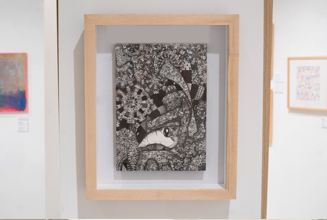 細やかな模様で構成された、噛み合わない歯車。世界中に繰り返しウィルスが広まった病をモチーフに、停滞した世界経済を描いています。キャンバスの中には独自の世界があり、何層にも見える歯車が、闇の中で動けずにいるような印象を受けました。