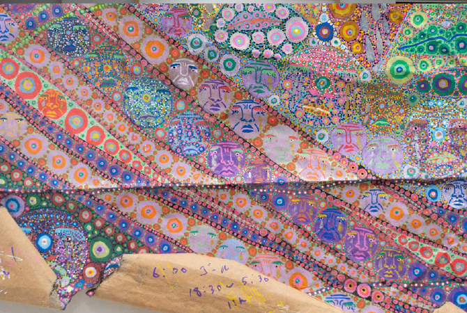 幅約1メートル、高さは160センチほどの大きな作品ですが、近寄って見ると、ひとつひとつが細胞のような模様で描かれていて、それらがいくつもの小さな顔を構成し、さらに引いて見ると大きな顔になっています。小さな顔がいくつも連なり、ひとつの大きな模様へとつながる様子は、珊瑚の産卵や、曼荼羅、宇宙などを思わせます。その制作期間はおよそ半年ほどにも及ぶそうです。