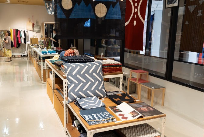 「d47 design travel store」では、86歳を超えてもなお、型彫り、糊つけ、染色までをすべてご自身で担う染色家・山内武志の作品が紹介されていました。期間中は、山内武志さんの師である芹沢銈介さんにまつわる話や、日々の制作にかける情熱の源についても伺うトークショーが開催されたほか、参加者が紋様を型紙に彫り、文庫本のカバーをつくるワークショップも開催されました。