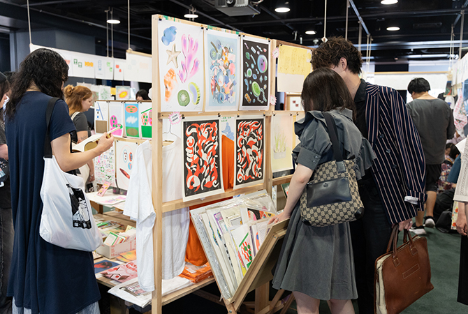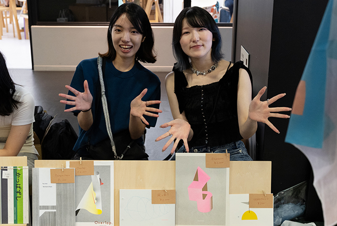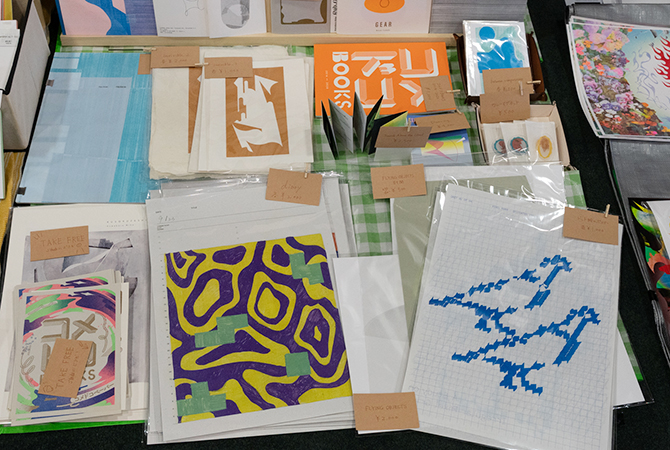 卒業してからも、全国各地に点在している仲間と連絡を取り合いつつ、グラフィックデザインやアート作品づくりに励んでいます。リソグラフ印刷に限らず、さまざま手法で作られた作品が展示販売されていました。