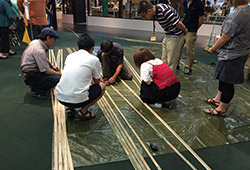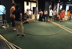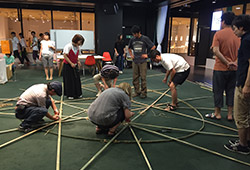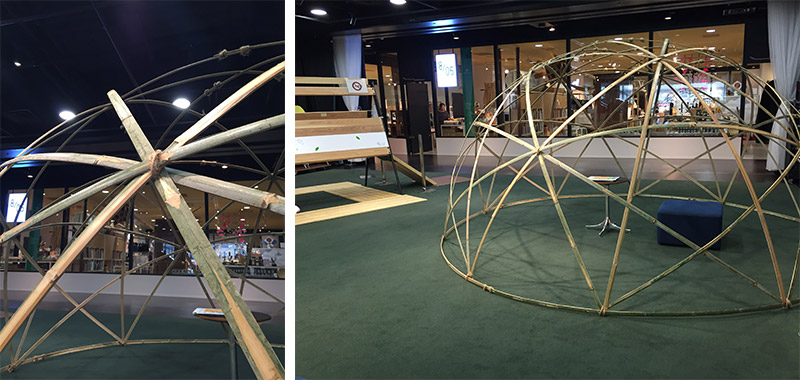 同日、COURTで開催されたワークショップ「竹のスタードームを作ろう」を見学しました。講師は、トークセッションで楽しいお話を聞かせて下さった高橋素晴さん。「10年ぐらい前からマイブーム」という丸竹を使って、半球型のドームのつくり方を教えてくれました。