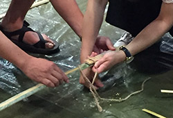 少ない材料で簡単に、竹のしなる性質を活かして最大限の空間をつくり出すスタードーム。5m弱の丸竹6本から、大人が10人ほどくつろげる円周12mの半球型のドームをつくります。当日の参加者は5人。みなさん、高橋さんの指導のもと、黙々と手を動かしていました。出来上がりまでのプロセスを、写真で追いかけます。