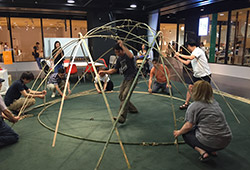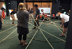 高橋さんの指導のもと、夢中でつくったスタードーム。これまでの構造を理解するために、60cmのヒゴを使って、直径40㎝、高さ20㎝のミニチュアドームをつくりながら総復習しました。2度目の作業とはいえ、プロセス4の組み合わせ方が難しい様子。完成後、解体して持ち帰ることもできますが、解体するのがもったいない…という方がほとんどでした。