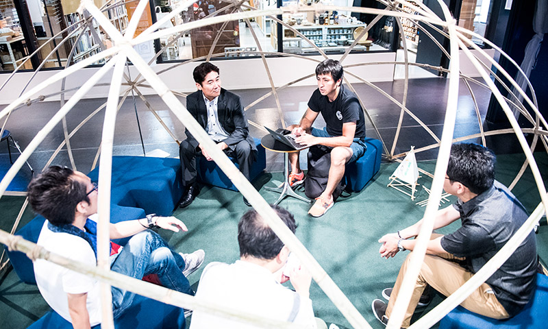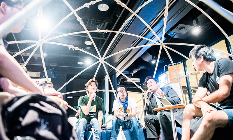 8月12日、COURTで行われたトークセッション。登壇者は、廃棄されていたみかんの皮を魚の養殖に活用し、新たなブランドを生み出した木和田権一さん、竹にあかりを灯しながら各地でまちづくりに挑戦する三城賢士さん、エコロジーをテーマに多数の番組を制作するラジオディレクターの上野恭平さんです。